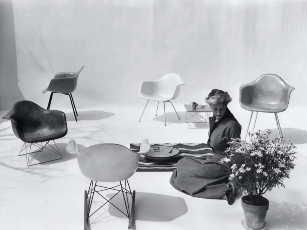 Charles y Ray Eames fueron pioneros en el uso de materiales como la madera contrachapada moldeada y la fibra de vidrio. Que le permitieron crear formas orgánicas y fluidas que se adaptaban a la anatomía humana. Su estética, a menudo descrita como modernista, se alejaba de la ornamentación excesiva, priorizando las líneas limpias y la honestidad de los materiales. La sinergia con Ray, con su visión más plástica y artística, fue crucial. Juntos, fusionaron la tecnología y la artesanía para crear un «look Eames» inconfundible: esbelto, moderno, juguetón y funcional.