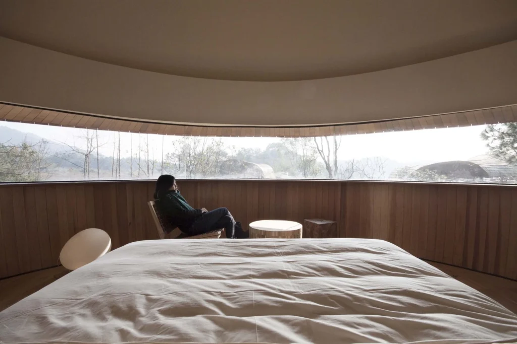 El diseño interior de la casa Hongo en China está pensado para una conexión constante con la naturaleza. La vivienda se distribuye en dos niveles. El primero está dedicado a una habitación de invitados, la cual cuenta con una amplia ventana panorámica que ofrece vistas ininterrumpidas del bosque. En el segundo nivel se encuentra un área de juegos, un espacio ideal para el descanso y el esparcimiento familiar. Además, el techo cónico de la casa, que imita la forma del sombrero de un hongo, está revestido con tablones de madera de pino, lo que le da una textura cálida y orgánica en contraste con el hormigón.