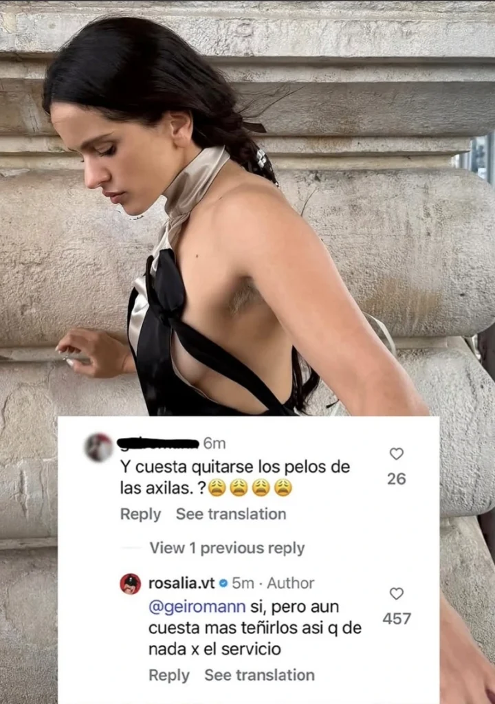 La elección de Rosalía demuestra que el debate sobre las artistas con vello en las axilas ha evolucionado. Su vello decolorado es, a la vez, una afirmación corporal (porque el vello está presente) y una nueva tendencia estética (porque el vello está intervenido y diseñado).