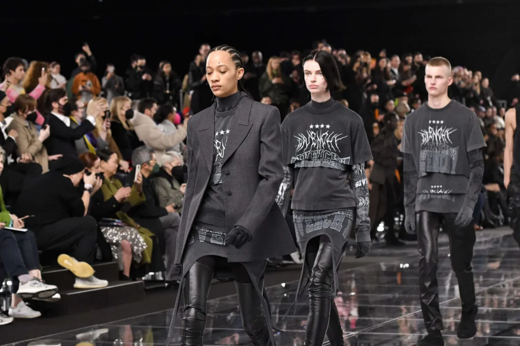 - Rick Owens: Conocido por su estética oscura y vanguardista, Owens continuó su exploración del brutalismo y la sensualidad con volúmenes asimétricos y una paleta de colores neutros, principalmente el negro.