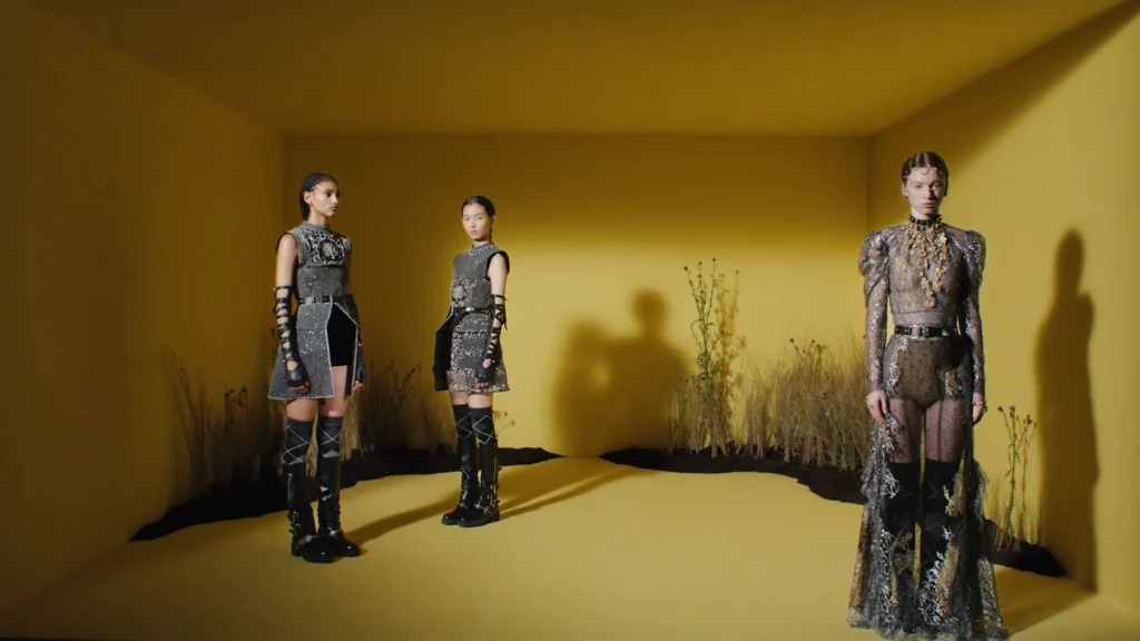 - Alexander McQueen: Bajo la dirección de Seán McGirr, la firma presentó una colección que mezclaba la influencia victoriana gótica con la sastrería contemporánea. Los diseños se caracterizaron por siluetas esbeltas, hombros exagerados, encajes texturizados y detalles florales complejos. Los accesorios como las botas alargadas y las joyas de inspiración victoriana completaron la visión.