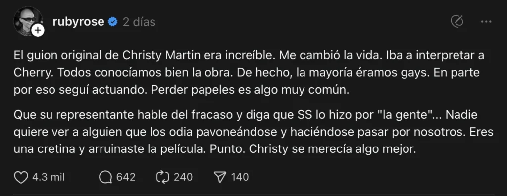 Esta declaración provocó un ataque directo y público por parte de la actriz Ruby Rose en Threads, quien elevó el debate a un plano personal y político. Rose acusó a Sweeney y su equipo de haber «arruinado» el biopic, declarando que «nadie quiere ver a alguien que los odia pavoneándose y haciéndose pasar por nosotros».
