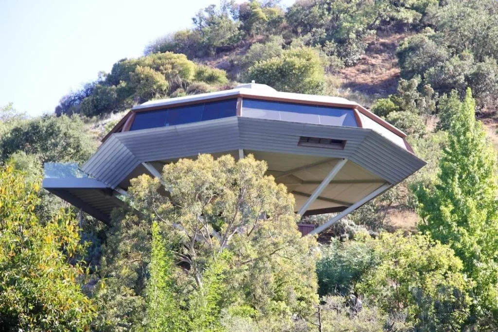El uso de concreto, madera y acero no era solo constructivo, sino también narrativo, creando ambientes que evocaban desde naves espaciales hasta cuevas futuristas, lo cual lo diferencia de muchos de sus contemporáneos que se enfocaron en una estética más minimalista. La casas de John Lautner se convirtieron en protagonistas por derecho propio en la gran pantalla, lo que consolidó su estatus de ícono cultural. El claro ejemplo es la Casa Chemosphere (1960), una vivienda en forma de platillo volador sobre un único pilar, que ha aparecido en innumerables producciones, evocando un futuro distópico o de ciencia ficción.