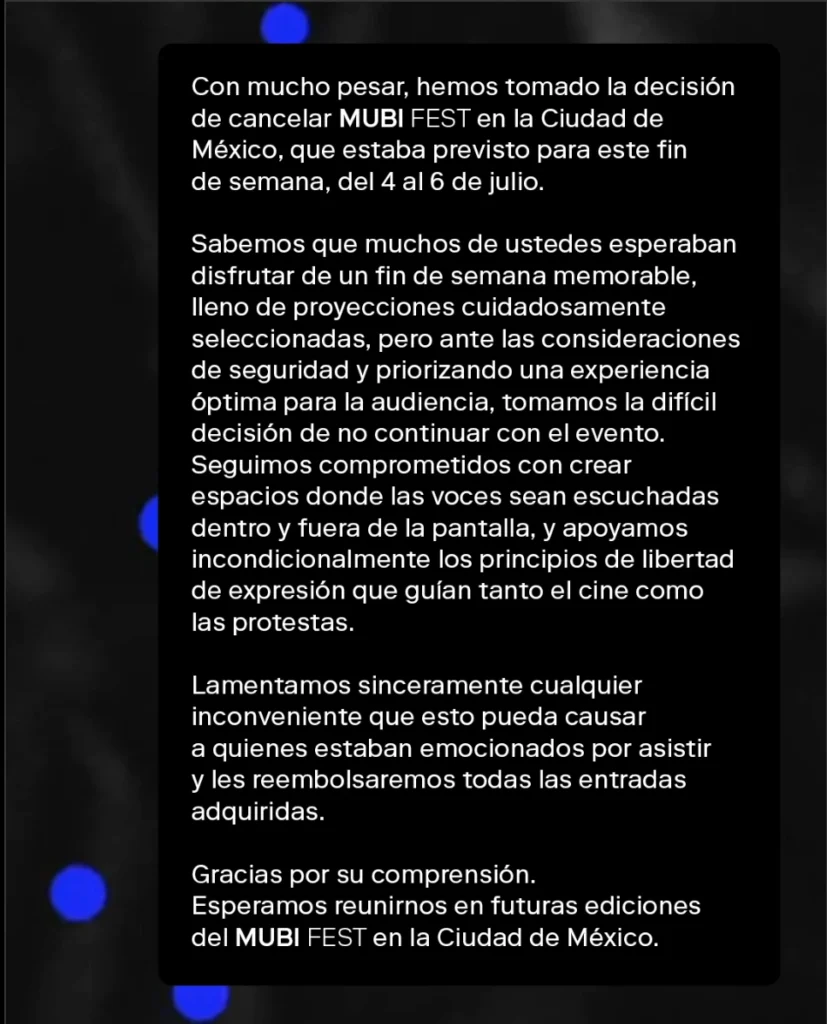 Este contexto de presión ciudadana y llamados a la acción se ha materializado recientemente en eventos culturales de gran resonancia. Un claro ejemplo de esta dinámica de boicot y protesta es la reciente cancelación del MUBI Fest en México, un suceso que ha capturado la atención en redes sociales y ha puesto de manifiesto el creciente apoyo a Palestina. La decisión de cancelar el festival, que se realizaría en la Cineteca Nacional, llegó tras una intensa campaña que señalaba su relación con Sequoia Capital, un fondo de inversión que activistas vinculan directamente a la ocupación israelí, incitando a simpatizantes a manifestarse en el lugar del evento para evitar su realización.