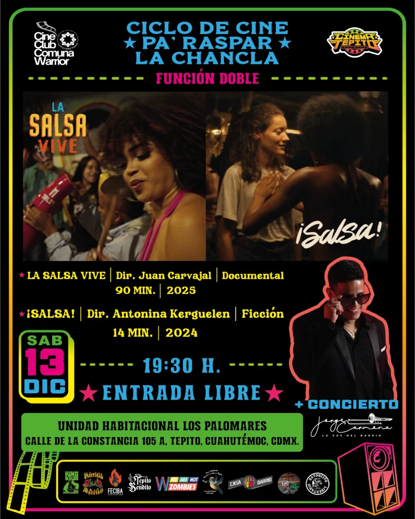 En colaboración con el Cineclub Comuna Warrior, Cinema Tepito presenta el ciclo de cine «Pa’ raspar la chancla«, una celebración de la música, el baile y la memoria popular. Este ciclo invita a mover el cuerpo y el corazón con historias que giran en torno a ritmos que han marcado generaciones, reflejando el espíritu vibrante de Tepito.