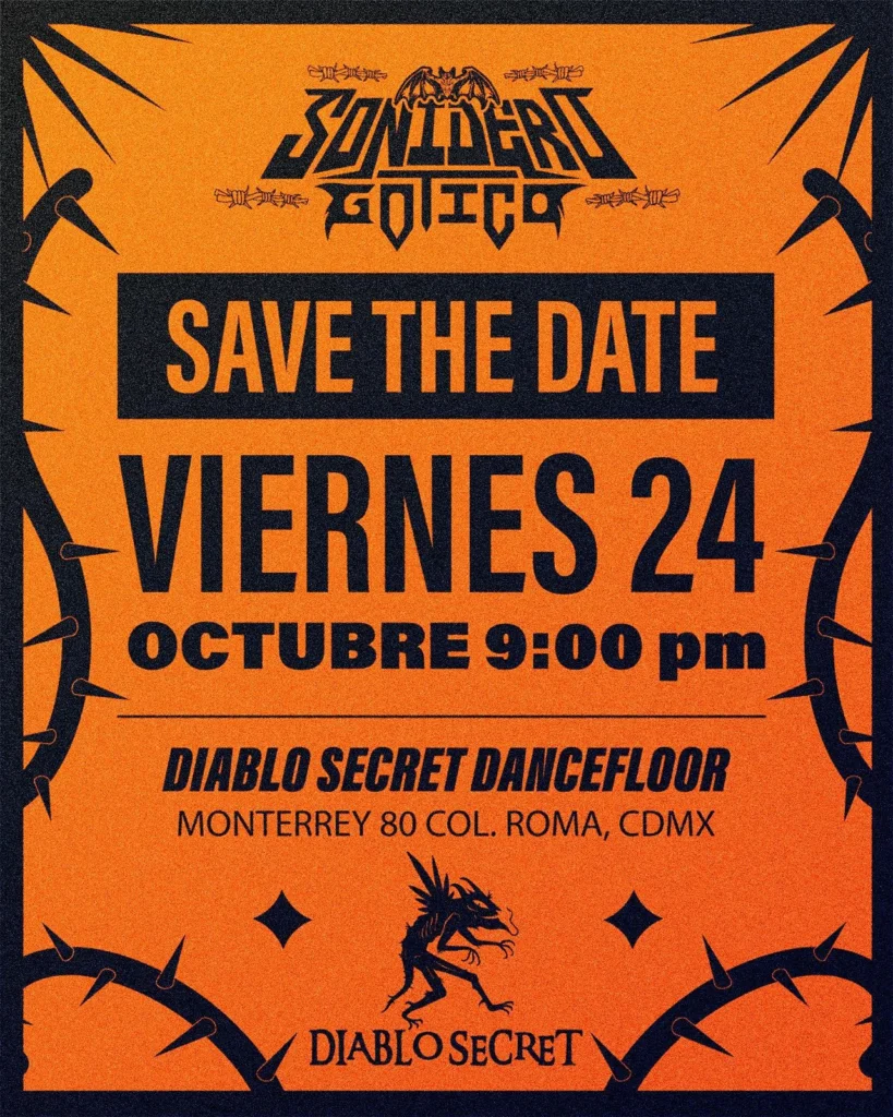Así que este próximo 24 de octubre en punto de las 21:00 horas, no te puedes perder esta edición mexa del Sonidero Gótico. Una noche imperdible y pensada para salir de la rutina y poder sacar los mejores pasos de baile bajo indumentarias goth y punk. La cita es en Monterrey 80, Col. Roma en el Diablo Secret Dancefloor. Cabe mencionar que ya se agotaron las preventas y sólo hay entradas limitadas el día del evento en $150, así que llega temprano para poder alcanzar. Síguelos en redes sociales para que no pase desapercibido ningún detalle de este fiestón.