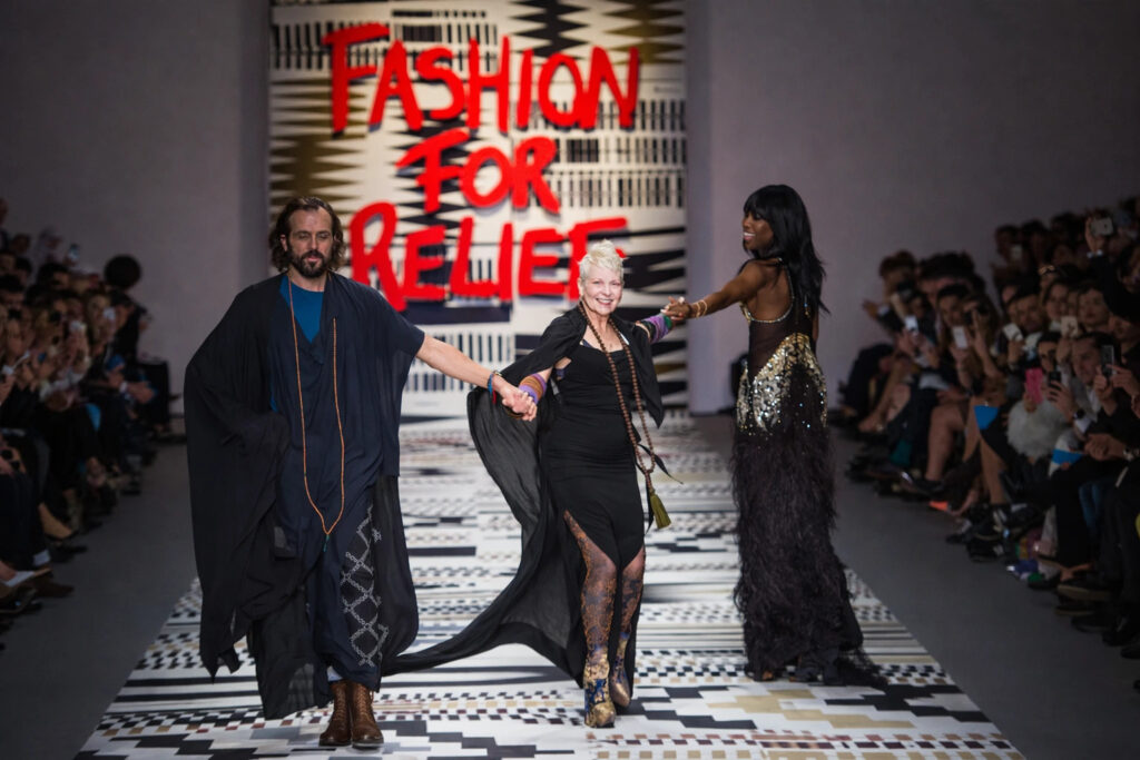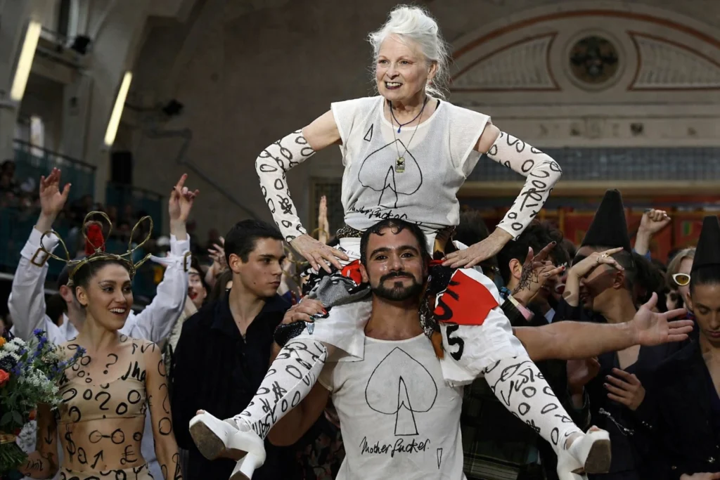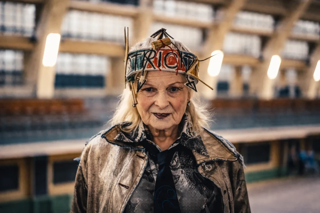 Más allá de sus diseños innovadores, Vivienne Westwood fue una ferviente activista social y medioambiental. Utilizó su plataforma en la moda para alzar la voz sobre temas cruciales como el cambio climático, la contaminación y la justicia social. Además, sus desfiles se convirtieron en plataformas para mensajes políticos. Sus colecciones a menudo llevaban nombres que reflejaban su preocupación por el estado del planeta, como «Climate Revolution» o «Propaganda«.